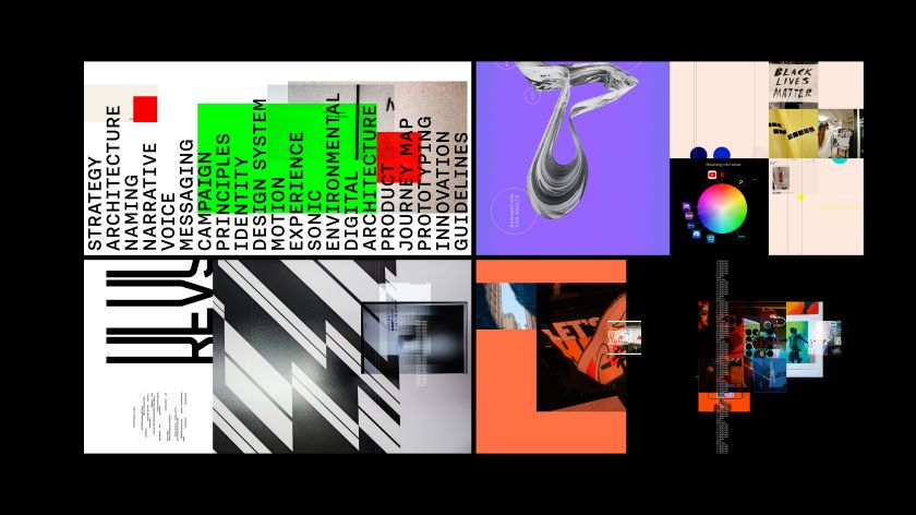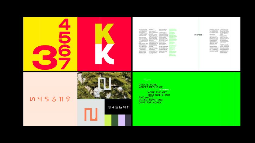 That’s why DixonBaxi favoured this overlapping, seemingly chaotic style throughout the book. Flicking through it, you’ll see that a health-tech exploration sits next to a sports identity; notes from a trip to Mexico slide underneath screenshots from a talk in LA; mundane Slack lines – “receipts please” – pop up between bold typographic experiments.