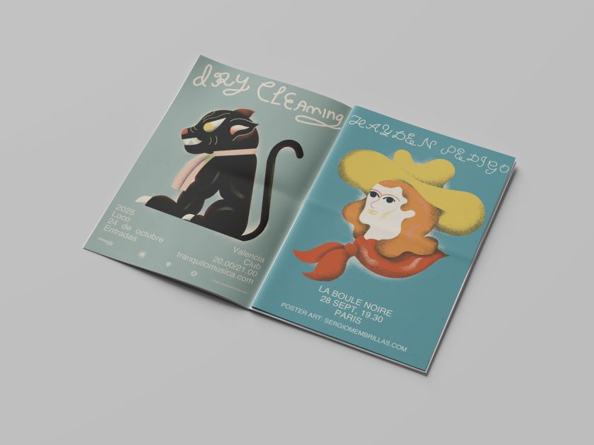 The publication functions as an archive of a specific period in Membrillas’ practice. Inside, posters for indie acts sit alongside work for more widely known artists such as Róisín Murphy, U.S. Girls, and Dry Cleaning. They span continents as well as scenes, from London, Stockholm, and Chicago to shows closer to home in Valencia. Seen together, the collection reveals both the consistency and range of his visual language and the cultural work that these posters do beyond the night of the gig itself.